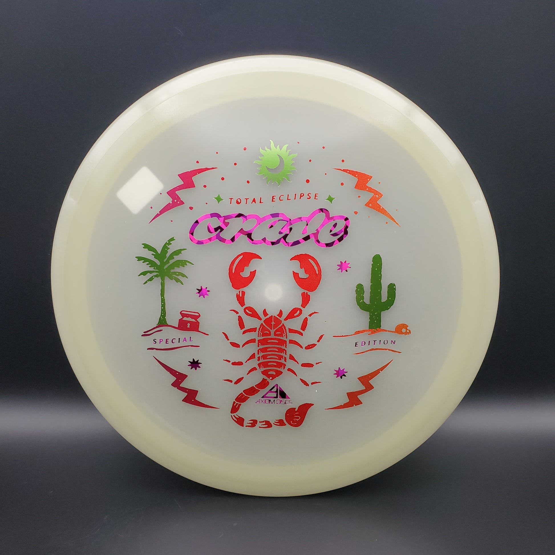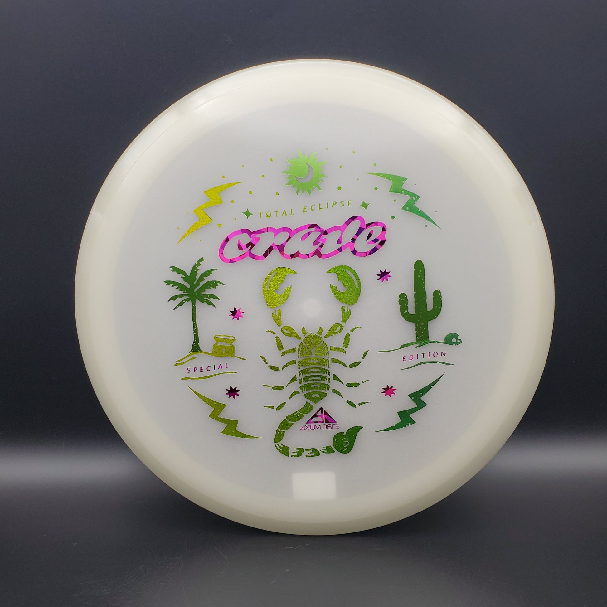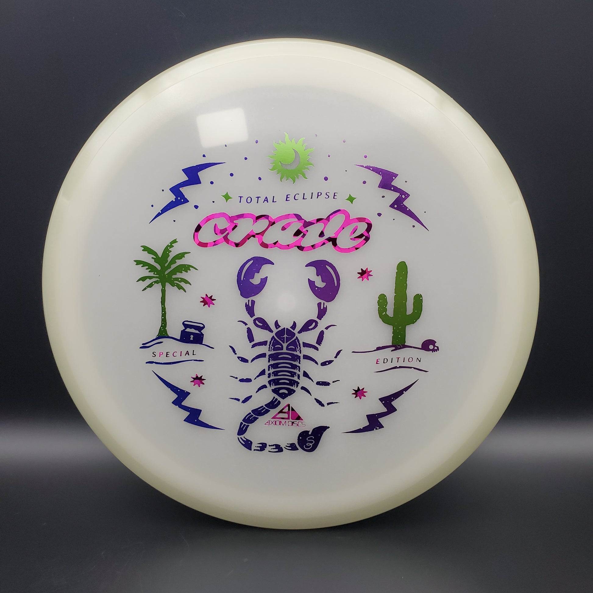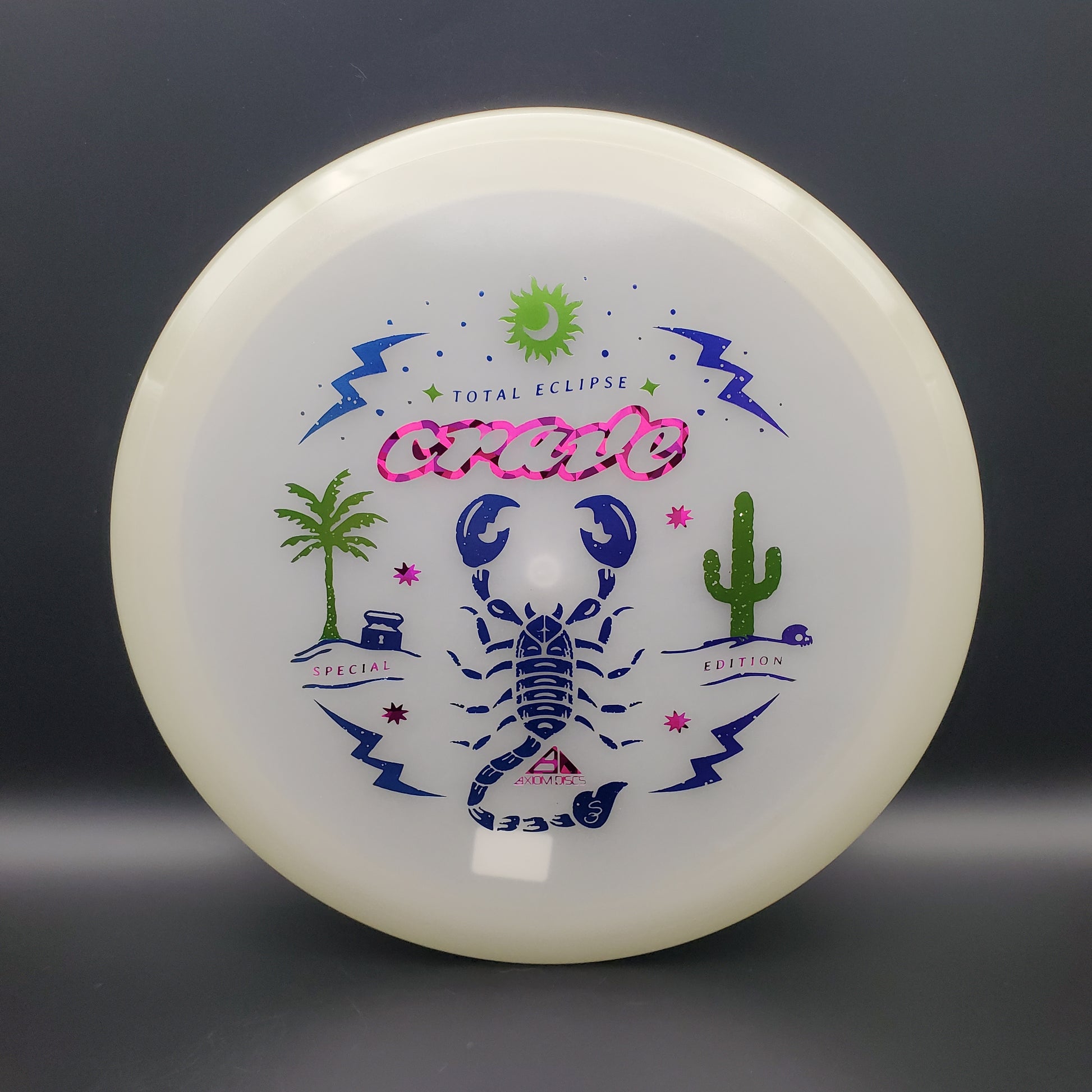 The hunt for your favorite new Crave is over! It may be December, but the tropical vibes carry on thanks to Scott Oswalt delivering a fresh illustration for the Special Edition Total Eclipse Crave. The workhorse fairway driver in the Axiom lineup, the Crave has proven time and again why it’s become a mainstay in bags around the world. Available in a variety of core and rim glow combinations from green, blue, teal, purple, and white, find your perfect combination!