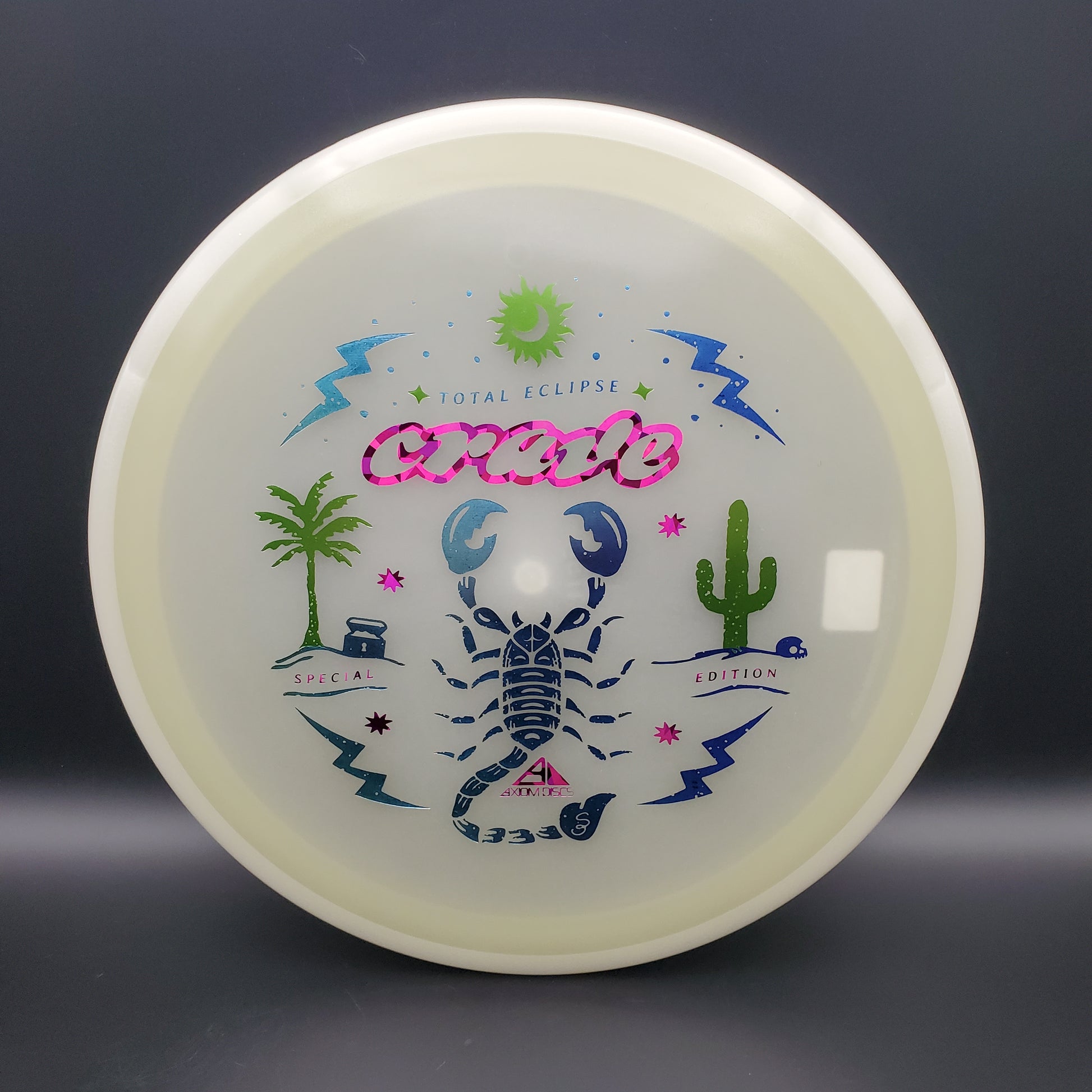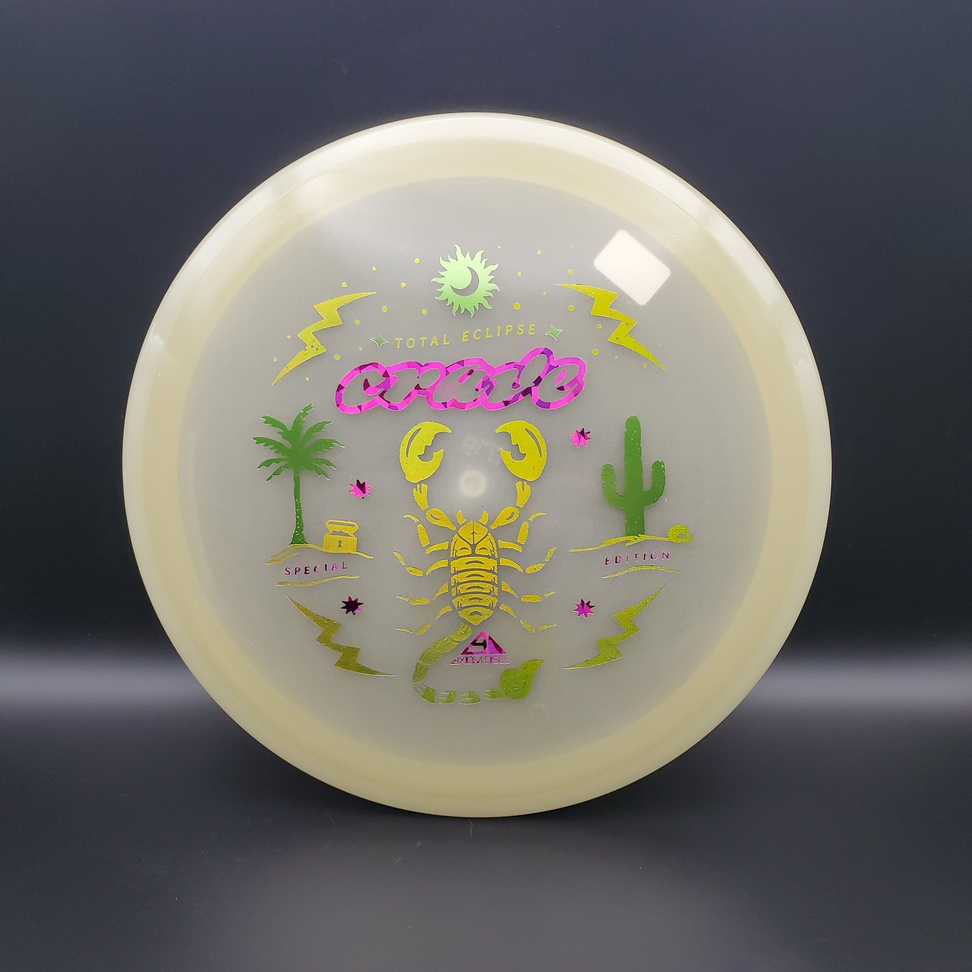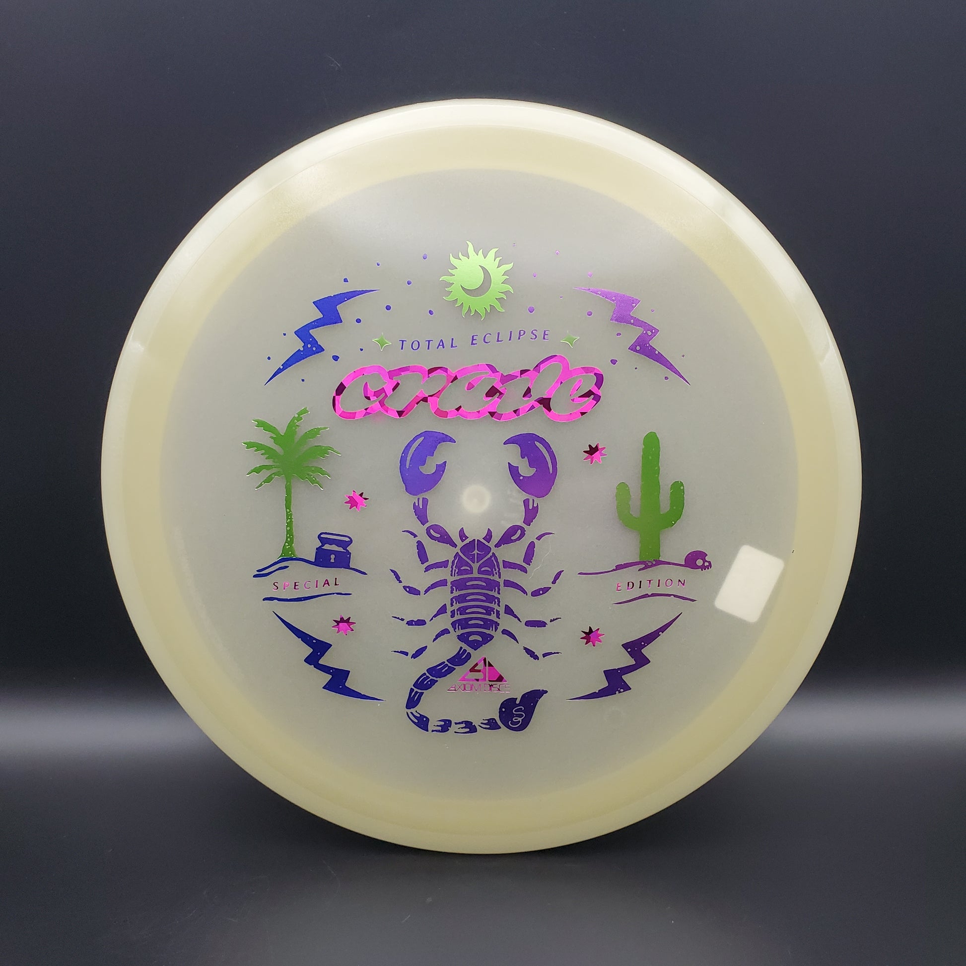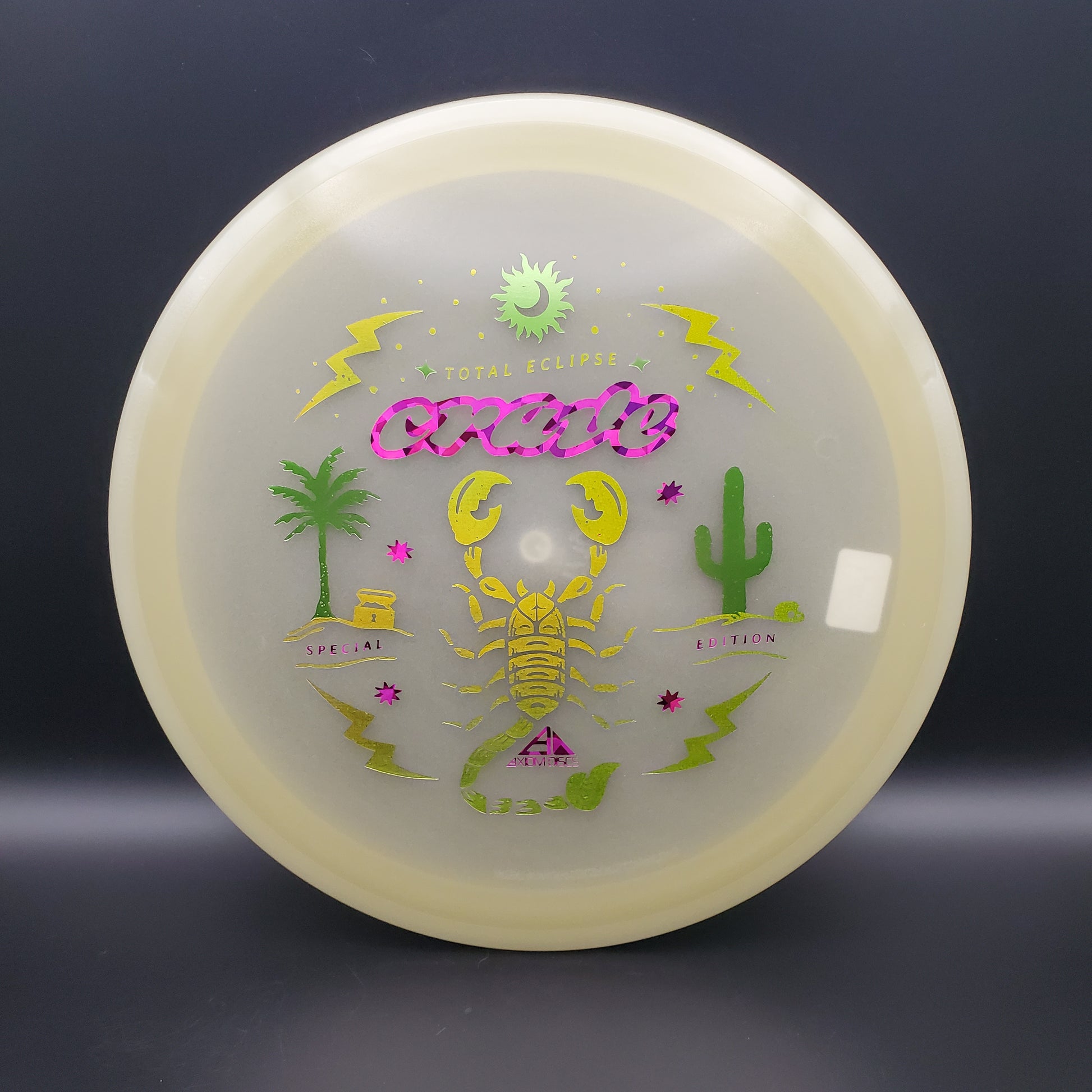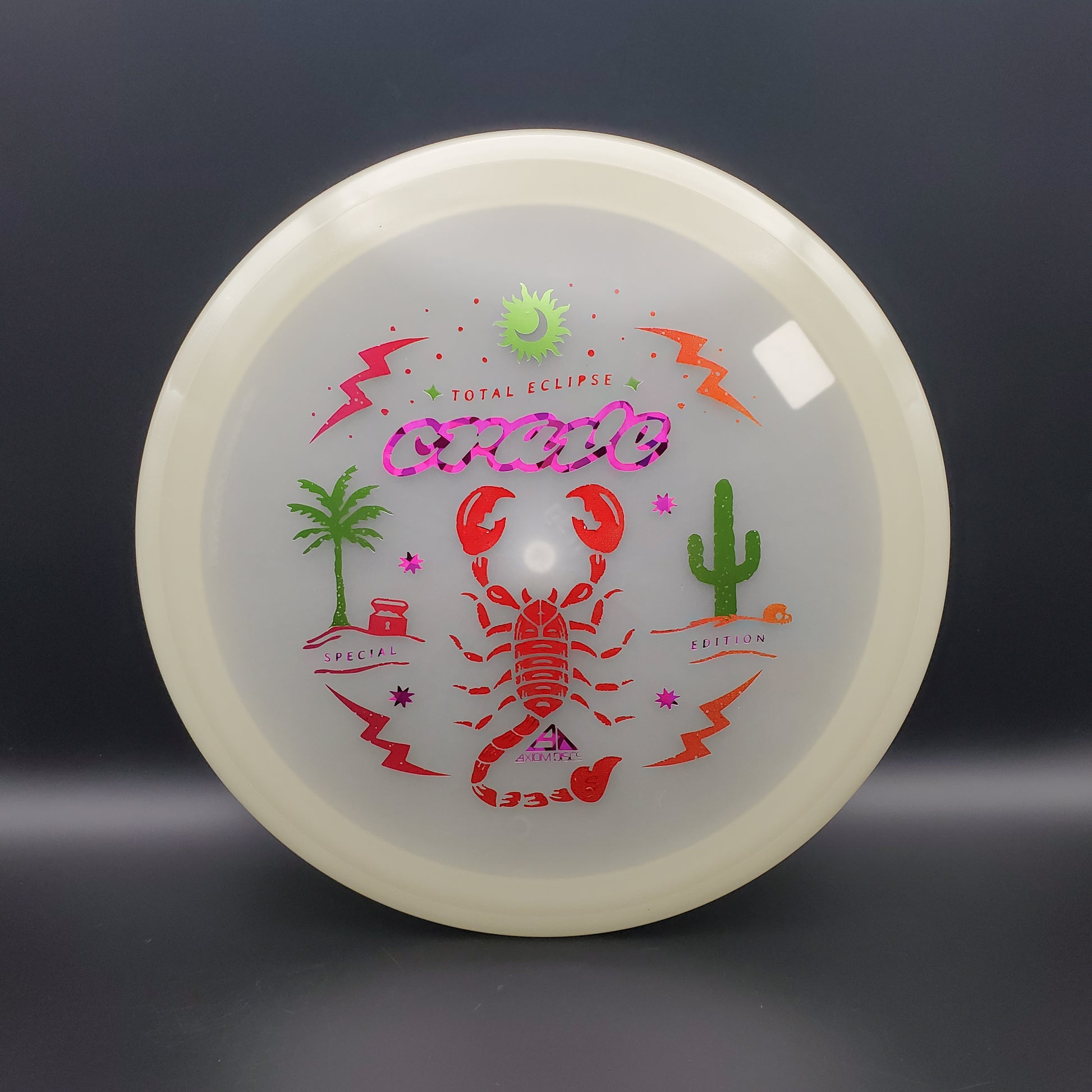 The hunt for your favorite new Crave is over! It may be December, but the tropical vibes carry on thanks to Scott Oswalt delivering a fresh illustration for the Special Edition Total Eclipse Crave. The workhorse fairway driver in the Axiom lineup, the Crave has proven time and again why it’s become a mainstay in bags around the world. Available in a variety of core and rim glow combinations from green, blue, teal, purple, and white, find your perfect combination!