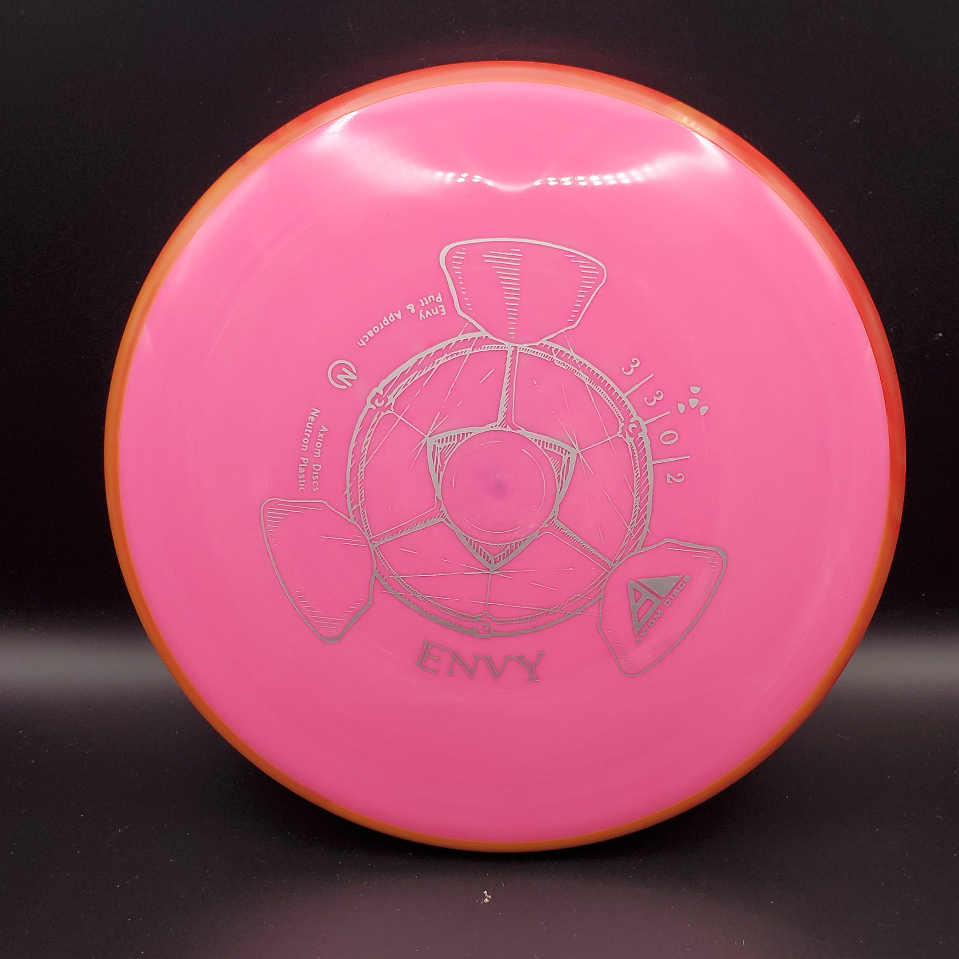 The Envy is a slightly overstable putt and approach disc. The Envy has a smooth modern feel that fits in the hand perfectly, lending confidence for both putt and approach duties. The Envy exhibits reliable high-speed stability and a minimal fade. With a slightly lower profile and cruising speed than the Ion and Anode class, the Envy is a uniquely “lid-like” stable putter. The Envy’s defining flight characteristic is its ability to hold a straight flight for power throwers, but also be a dependably stable approach disc for lower power throwers. Its medium depth offers a healthy balance of straight flight paired with an easy clean release. While its flight stability is largely similar to the MVP Ion, the Envy offers an entirely new feel. Its versatile stability on any type of shot will help the Envy find its way into every Axiom thrower’s bag.