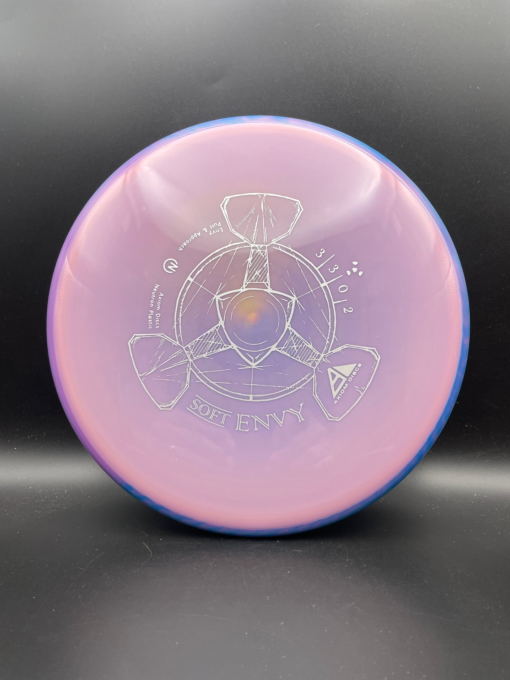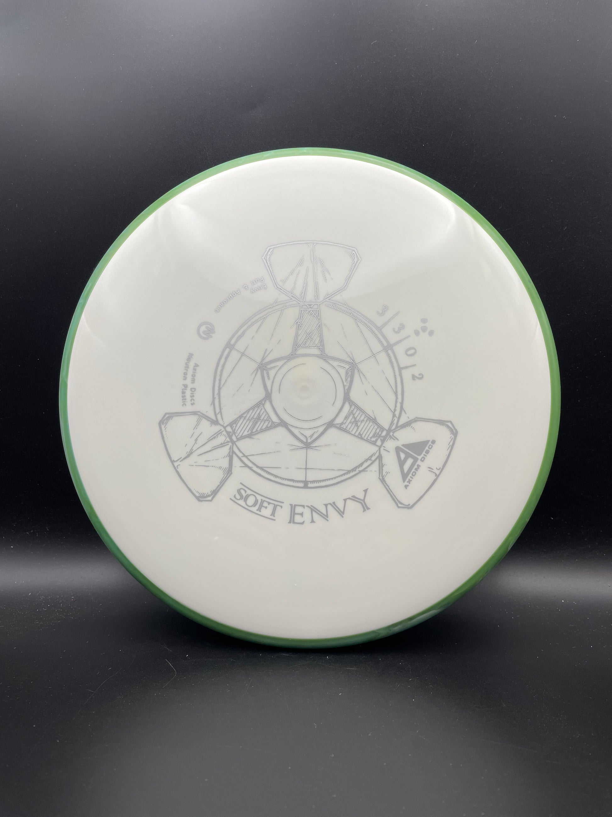 The Envy is a slightly overstable putt and approach disc. The Envy has a smooth modern feel that fits in the hand perfectly, lending confidence for both putt and approach duties. The Envy exhibits reliable high-speed stability and a minimal fade. With a slightly lower profile and cruising speed than the Ion and Anode class, the Envy is a uniquely “lid-like” stable putter. The Envy’s defining flight characteristic is its ability to hold a straight flight for power throwers, but also be a dependably stable approach disc for lower power throwers. Its medium depth offers a healthy balance of straight flight paired with an easy clean release. While its flight stability is largely similar to the MVP Ion, the Envy offers an entirely new feel. Its versatile stability on any type of shot will help the Envy find its way into every Axiom thrower’s bag.