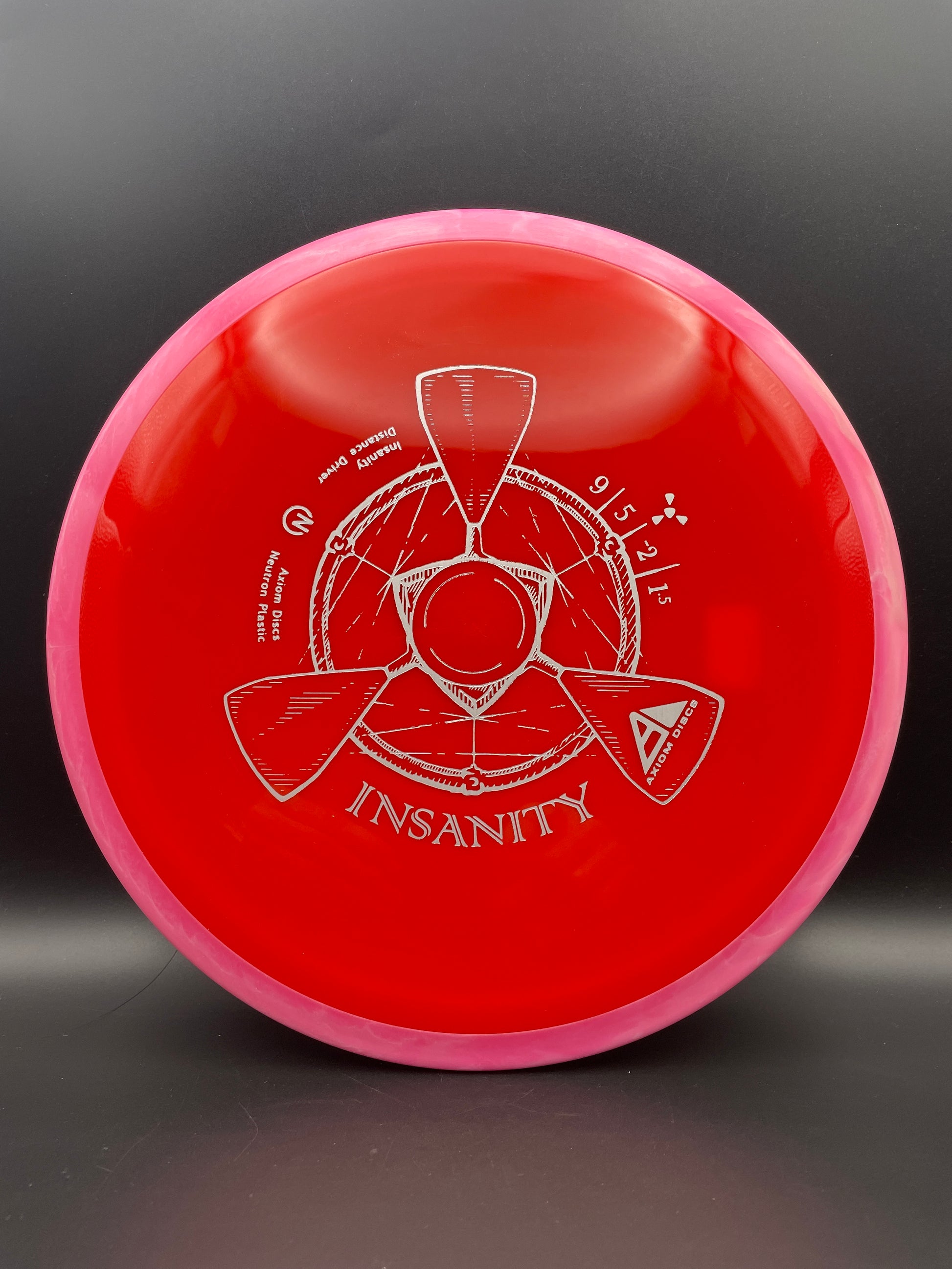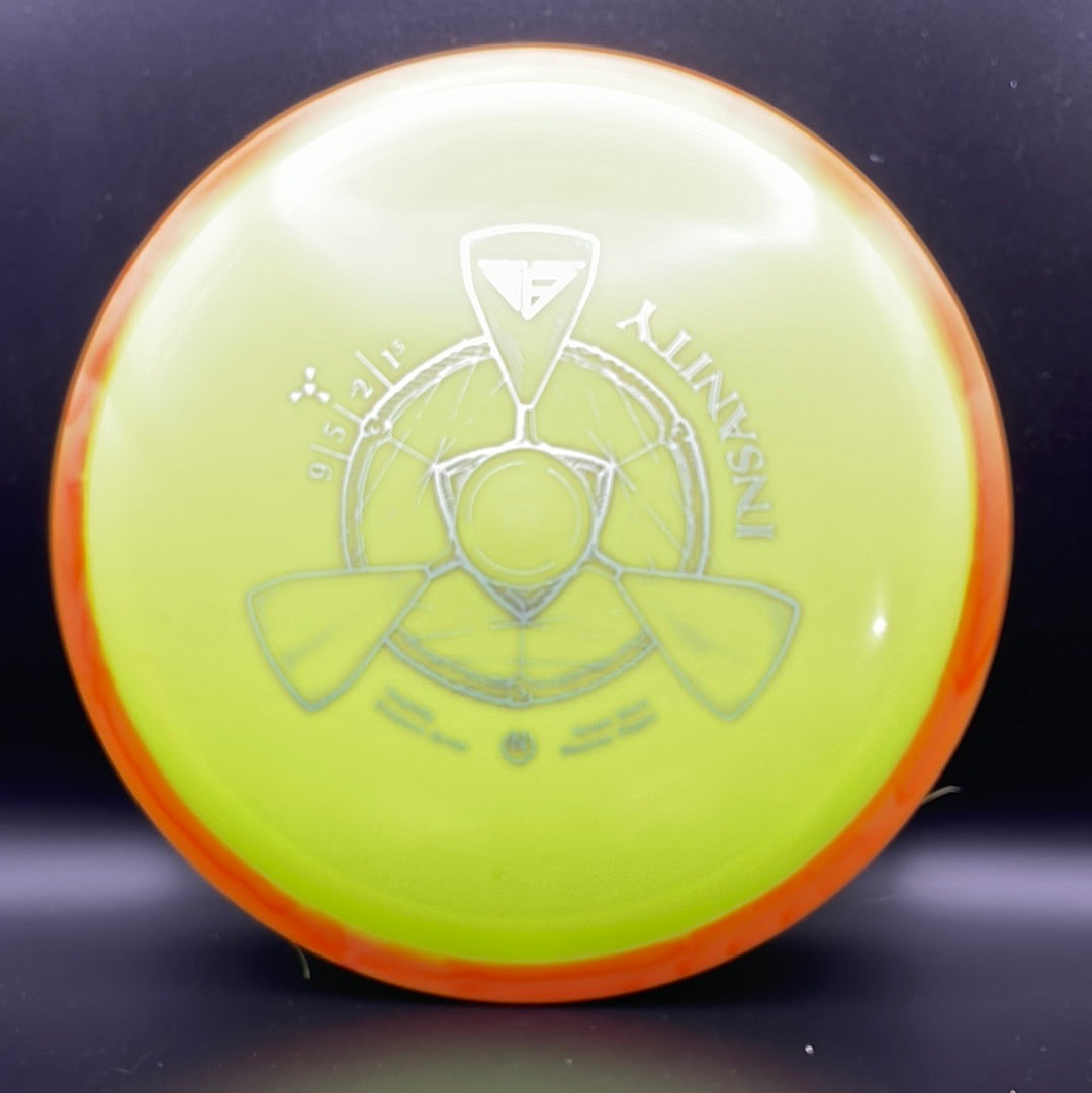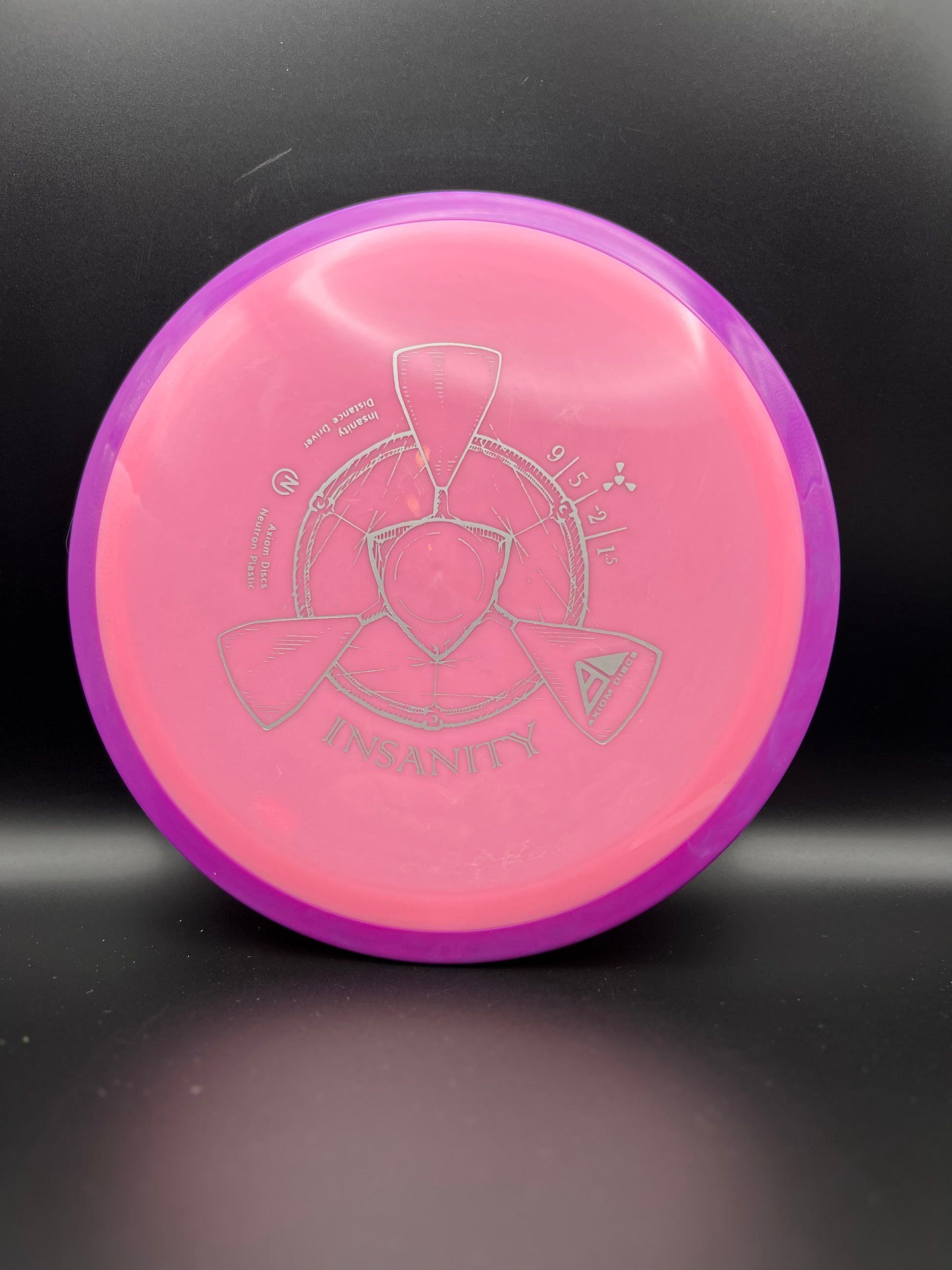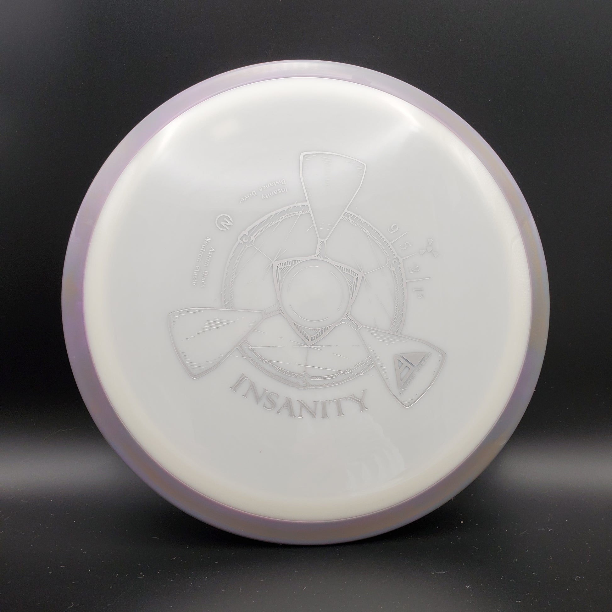 The Insanity is a stable-understable distance driver. The Insanity is best described as a worn-in MVP Inertia, with slightly more high-speed turn and a diminished fade. For average power throwers, the Insanity will be remarkably straight, while high power throwers can execute precise flip and turnover lines with ease. Whether you’re looking for that sweet-spot worn disc flight, or you’re looking to achieve bigger Inertia lines with less power, give Insanity a shot. The defining characteristic of the Insanity’s flight is its slow turn and straight fade, crafted by design with softened shapes to mimic a worn Inertia. Thusly the Insanity needs less power to execute certain Inertia flights and will exhibit a bit more turn and a noticeably more neutral fade portion than the Inertia. High power throwers will see enhanced glide and forward carry at low speeds, making it useful for a variety of low-ceiling shots and higher tailwind-riding lines. Average power throwers will see the most advantage with low height drives that gain distance and have enough stability to easily range. The Insanity is most suited to backhand drives, and either highly skilled forehands, or beginner-power forehands. Its high-speed turn excels for hyzer-flip drives, turnovers, and smooth-power flat ,, as well as a variety of utility and tailwind shots.