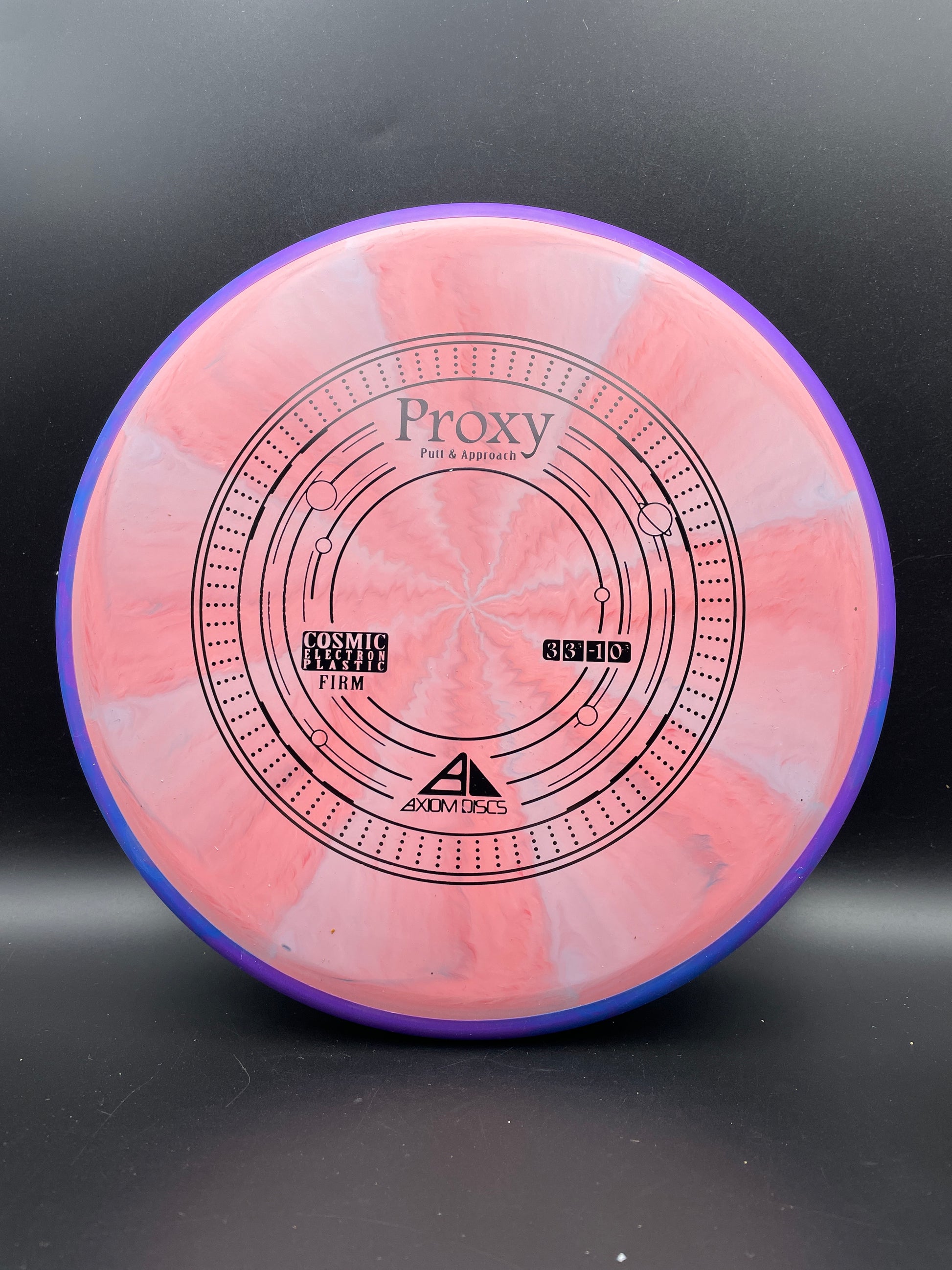 THE PROXY IS A STRAIGHT-STABLE PUTT AND APPROACH DISC. The Proxy shares the Envy mold’s core, lending the same low-profile feel and solid grip, along with a short wing width and wide flight plate diameter for superior glide. The Proxy sets itself apart from the Envy with a remarkably straight forward-fading finish. A bit of high-speed turn potential allows the Proxy’s lines to be manipulated over a broad range of power and helps less powerful throwers achieve straight putter drives. The Proxy’s defining flight characteristic is its ability to hold a straight flight at high speeds, but demonstrate the low-speed straight properties of a much more understable model’s ending stage. The Proxy is designed to exhibit the neutral straight-flying characteristic of classic “main” putters. Rather than requiring an extra wind-resistant overstable complement solely for harder throws, the Proxy is able to lock in with a similar high-speed stability as the Envy. Its neutral stability at a wide range of speeds will help the Proxy find its way into every Axiom thrower’s bag.