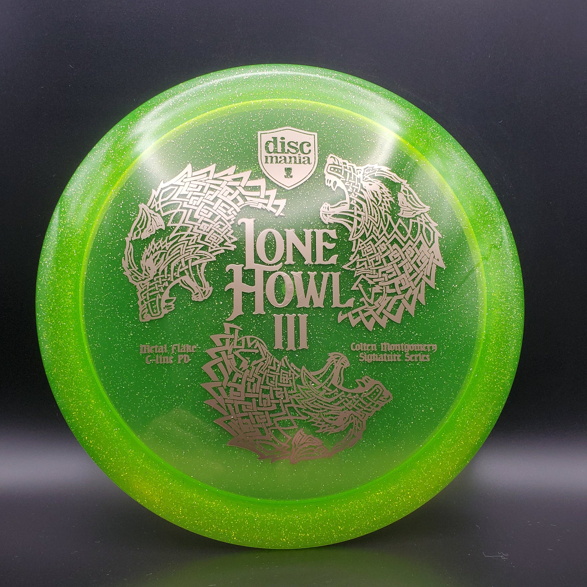 Colten Montgomery "Lone Howl 3" 2022 Signature Series: Colten Montgomery’s Lone Howl gains a shiny metal flake flair and returns for a third helping in the form of Lone Howl 3. The triad of wolves pictured on this design pay tribute to the original version released back in 2019 This is the first ever PD released in Discmania's new metal flake plastic and it did not disappoint! Flat and durable with grippy C-Line plastic to give it that extra “bite”. Compared to the current reinvented runs of PD produced so far, the Lone Howl sits happily in the middle between C-Line and the recent straighter flying Nordic Phenom. “Quote from Colten here. Lorem ipsum blah blah blah”. Sales of this disc help to directly support Colten on tour.
