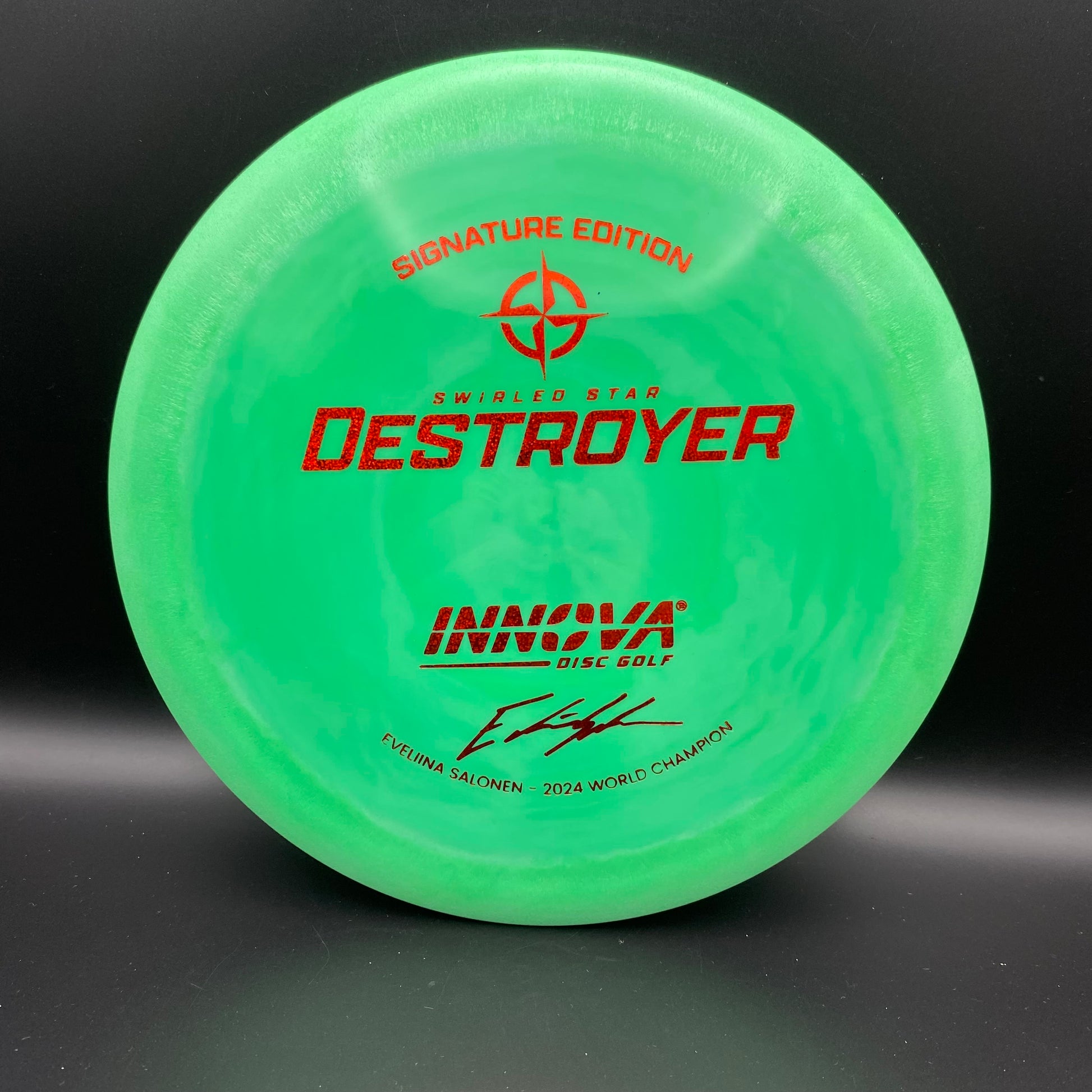 Eveliina Salonen Signature Edition Swirled Star Destroyer - Introducing the Eveliina Salonen Signature Swirled Star Destroyer—honoring her victory at the 2024 PDGA Pro World Championships. Featuring our gold-standard Distance Driver molded in a vibrant, swirled-Star blend with a minimalist, text-driven stamp. Available in <150g to 175g and endless material colors, swirl patterns, and foils—there’s a perfect disc for every player.