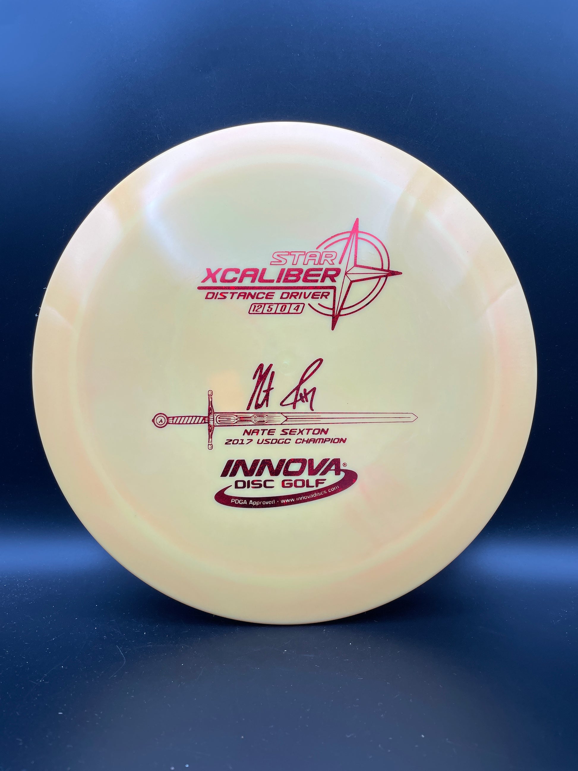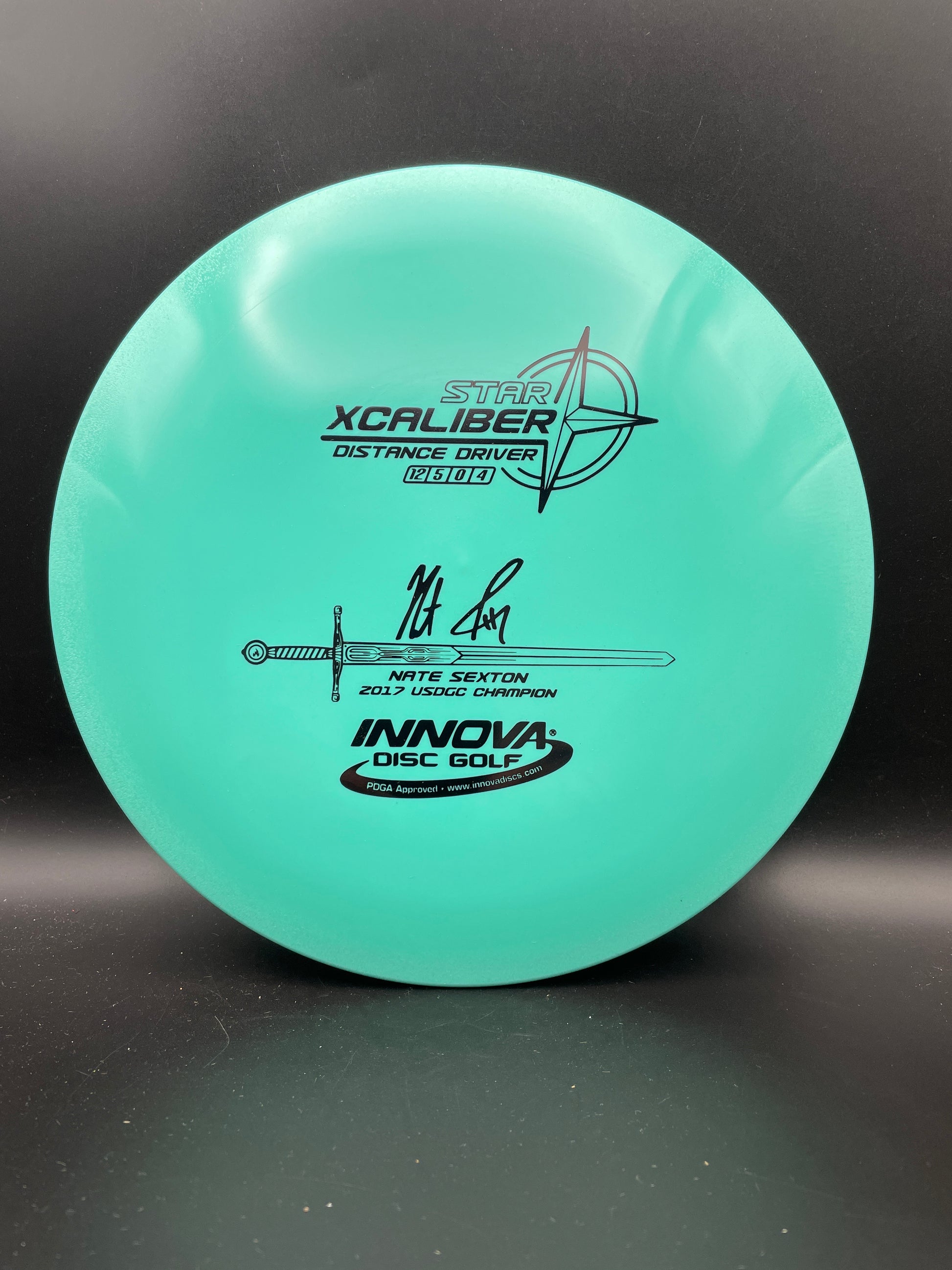 The XCaliber is extremely fast with glide and stability. The XCaliber achieves maximum distance when thrown low, flat, and hard. This is the one for confident bombs in windy conditions. The XCaliber has the stability to let the biggest arms throw with full power. Great disc for sidearm throwers and those with lots of power. Can handle headwinds and throws with off axis torque. Definitely not designed for beginning players.