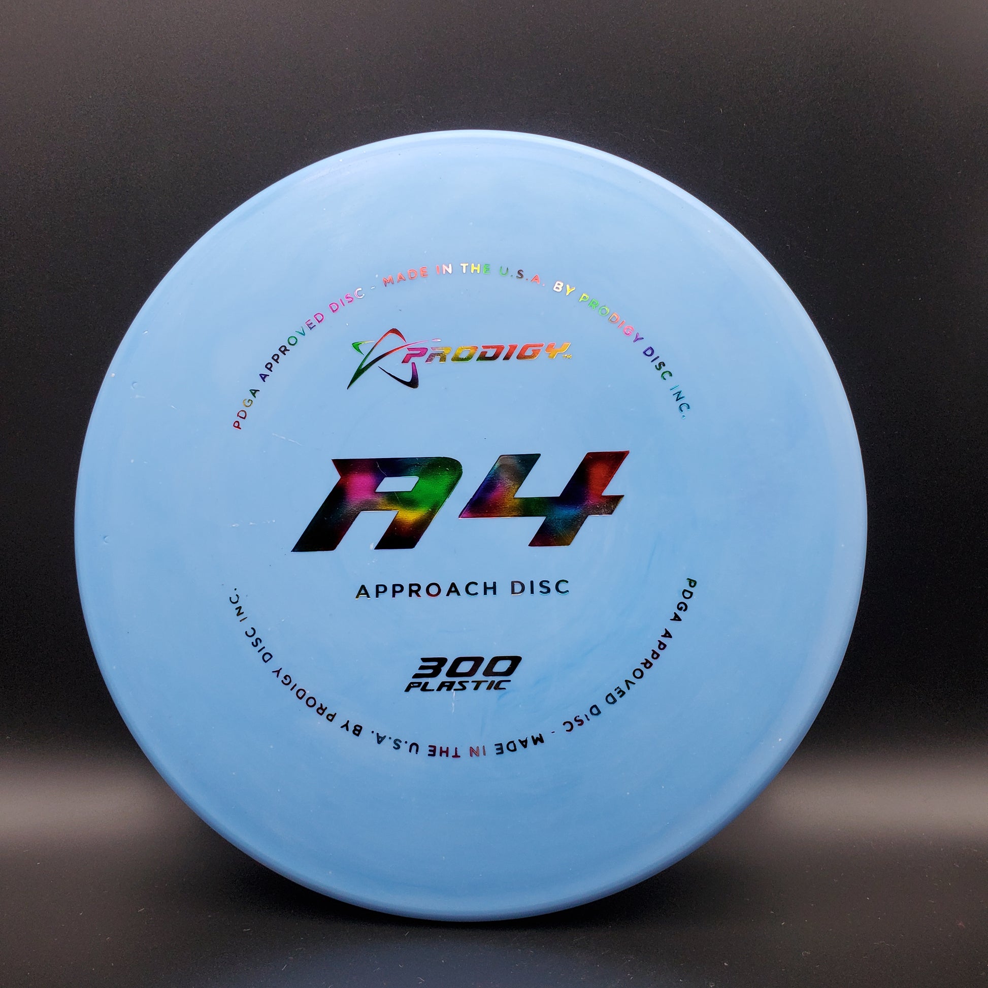 The all new A4 is the latest in our range of approach discs. The A4 is a slightly over stable disc that fills the distance gap between midranges and putters and is designed for all skill levels. The disc is consistent and reliable in moderate wind conditions and perfect for short approach shots. It works equally as well for backhand or sidearm throwers. The A4, like the A3 has a bead on the rim. You can expect it to fly slightly less stable than the A3 with an extra 40-50 feet in distance.