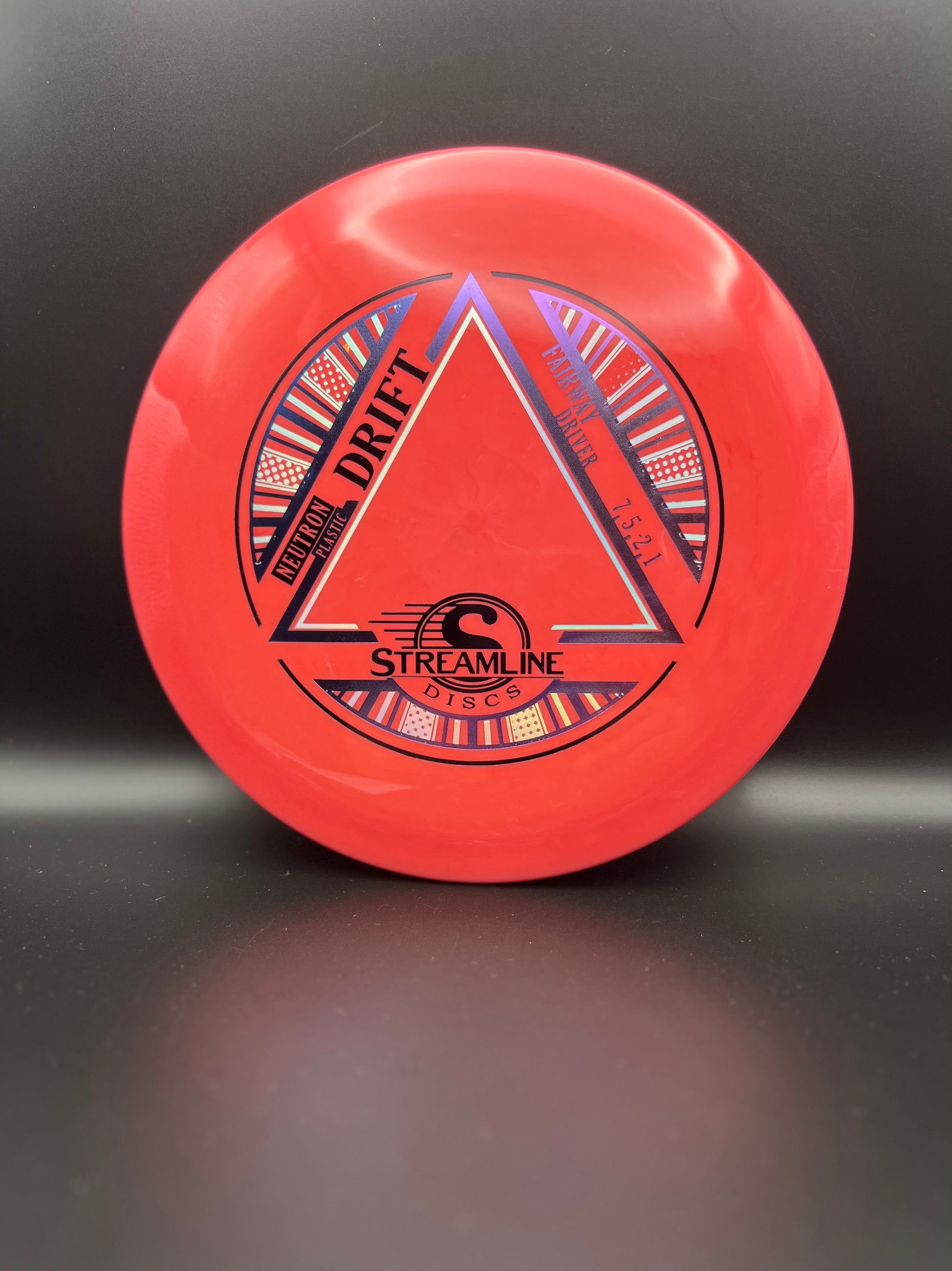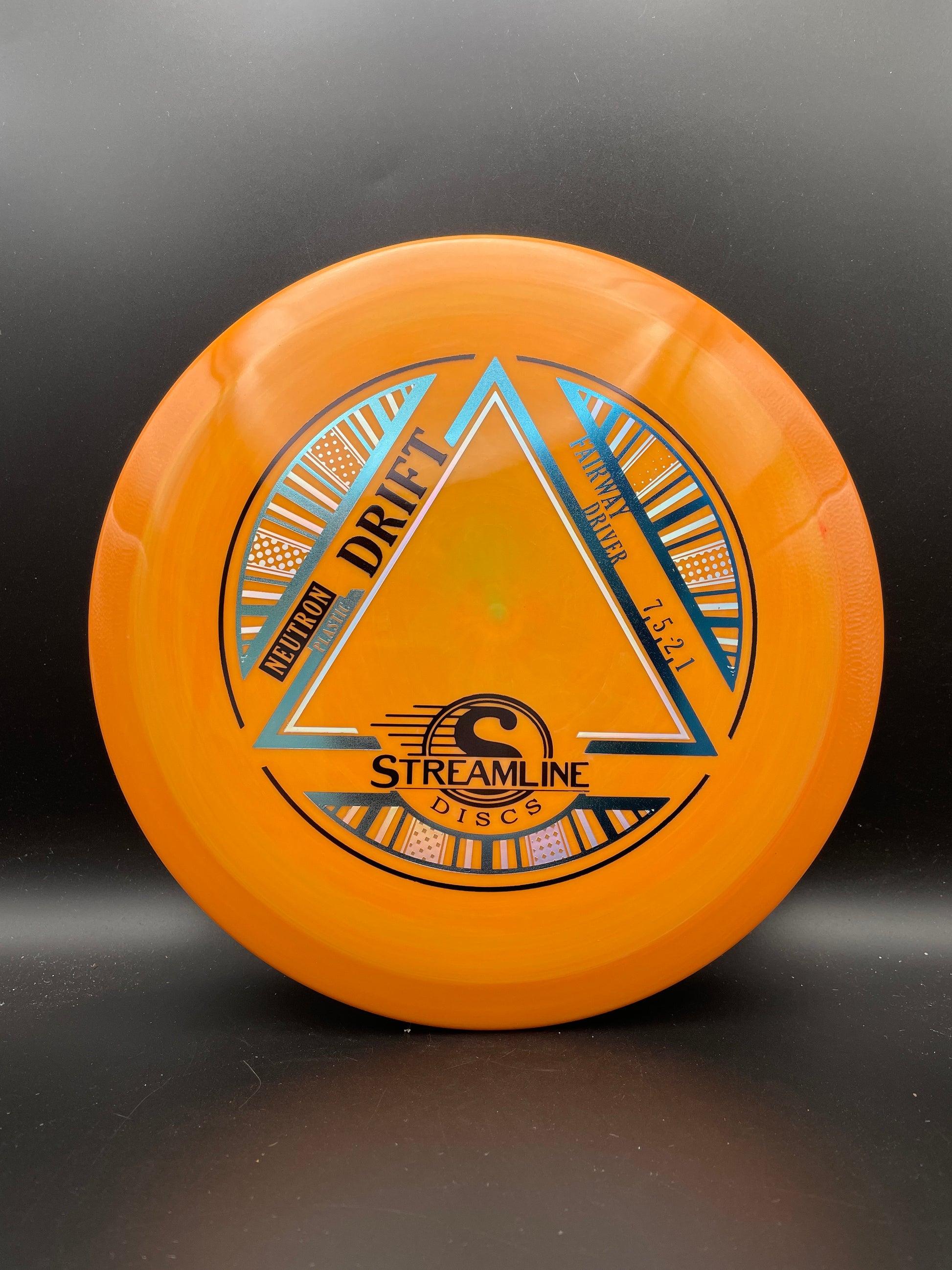 The Drift is a stable-understable fairway driver. The Drift is designed for laser straight lines ending with a gentle fade and an exceptional amount of glide, providing easy distance with this highly versatile driver. The Drift has a modest rim size, a slightly domed profile, and an easily activated turn for hyzer-flips or big turnover shots. The Drift will make its grand debut in Neutron Plastic, pairing perfectly with its bright opaque colors, durability, and grip. This Speed 7 driver is the first fairway driver in the Streamline fleet and continues the trend of stunning triple-foil stock stamps.