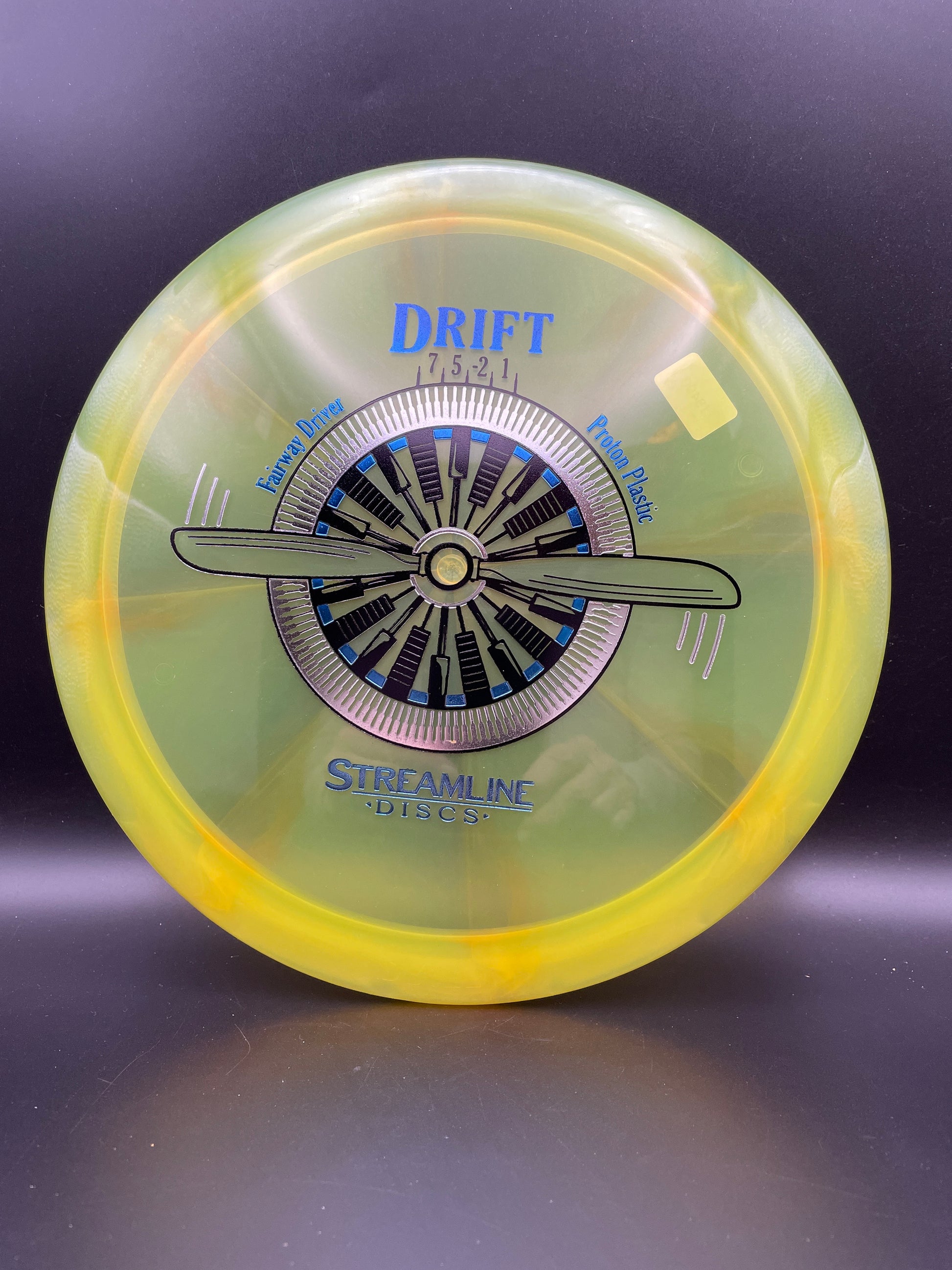 The Drift is a stable-understable fairway driver. The Drift is designed for laser straight lines ending with a gentle fade and an exceptional amount of glide, providing easy distance with this highly versatile driver. The Drift has a modest rim size, a slightly domed profile, and an easily activated turn for hyzer-flips or big turnover shots. The Drift will make its grand debut in Neutron Plastic, pairing perfectly with its bright opaque colors, durability, and grip. This Speed 7 driver is the first fairway driver in the Streamline fleet and continues the trend of stunning triple-foil stock stamps.