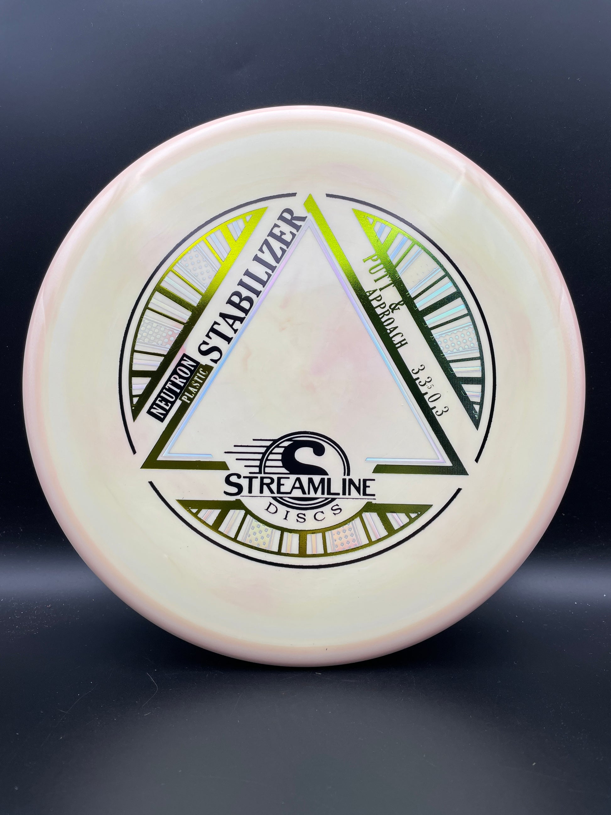 The Stabilizer is a new overstable putter from Streamline Discs, making its debut in Streamline Neutron and Cosmic Neutron plastic. This is the second putter from Streamline Discs and is the overstable compliment to the Streamline Pilot. The Stabilizer has a similar hand feel and depth as the Neutron Pilot, but with a slightly raised shoulder and more pointed nose that produces a flatter and more stable putter. The Stabilizers defining flight characteristic is straight flights with minimal turn, into a strong finishing fade for point and shoot accuracy on the approach.
